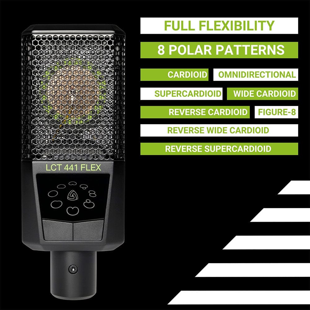 The LCT 441 FLEX is a compact multi-pattern studio microphone. It features high-spec technology and eight different polar patterns. You'll be more flexible when it comes to recording different instruments or vocals. It also allows switching between high directivity or more room impression and provides freedom to experiment.